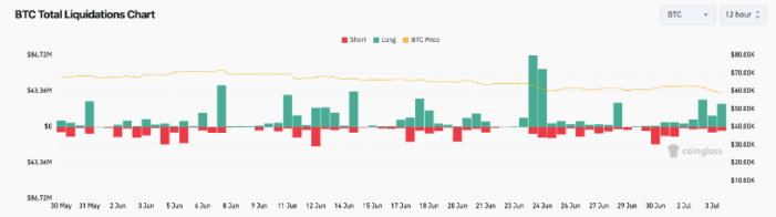 دادههای منبع نظارتی کوین گلس، لیکوییدی بیتکوین 24 ساعته را در زمان نگارش نزدیک به 60 میلیون دلار نشان میدهد.