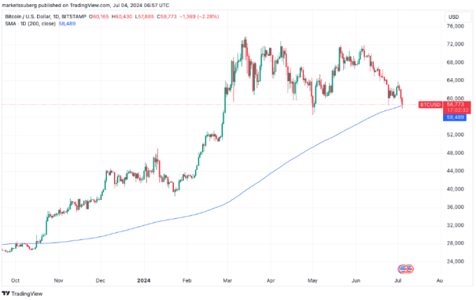 بیت کوین در 4 جولای بیش از 2 درصد سقوط کرد زیرا یک خط پشتیبانی کلیدی اولین آزمایش مجدد خود را از اکتبر 2023 تجربه کرد.