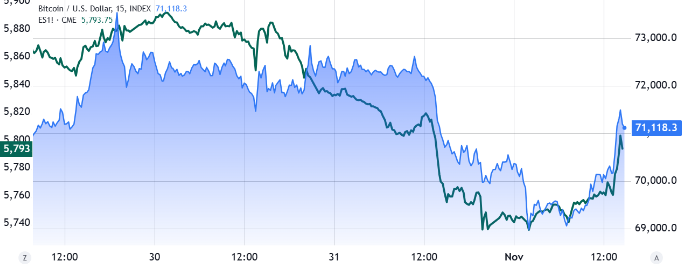 از نقطه نظر معاملاتی، تضمین سود قبل از بهبود سیاسی و اقتصادی بیت کوین به 71000 دلار در اول نوامبر می تواند ارتباط نزدیکی با حرکت های شاخص S&P 500 داشته باشد که نشان می دهد هر دو بازار به شاخص های کلان اقتصادی مشابه واکنش نشان می دهند.