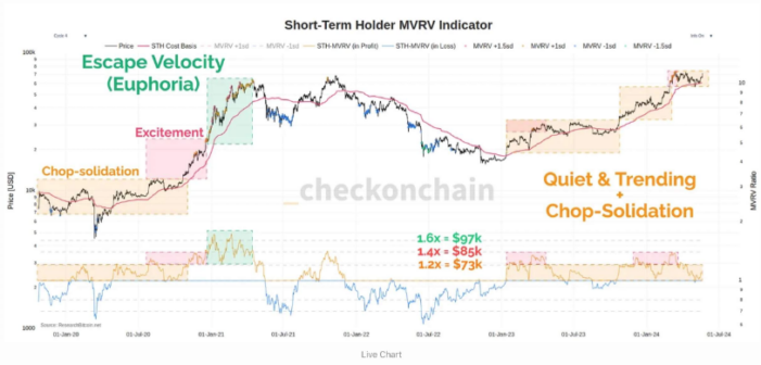 چک به معیار ارزش بازار دارنده کوتاهمدت (STH) تا ارزش تحقق یافته (MVRV) اشاره دارد، که او توضیح میدهد که نشان میدهد بازار هنوز «بیش از حد کشیده، بیش از حد خرید و بیش از حد اشباع نشده است».