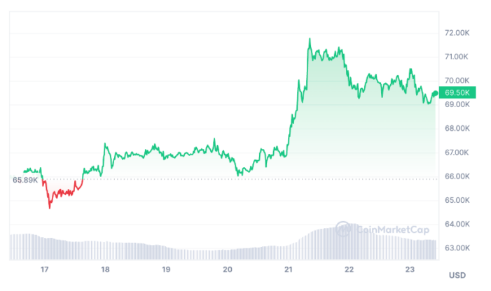 طبق دادههای کوین مارکت کپ، جهش به 73000 دلار از قیمت فعلی 69088 دلار حدود 5.6٪ است .