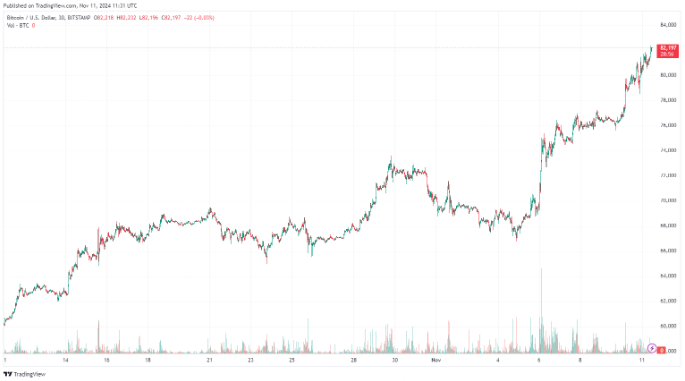 داده های بیت استمپ نشان می دهد که قیمت بیت کوین در ساعت 10:19 صبح UTC در تاریخ 11 نوامبر به بالای 82,410 دلار رسید.