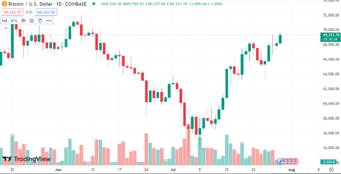 طبق گزارش تریدینگ ویو، قیمت بیت کوین در ساعات معاملات آسیا در 29 جولای به 69775 دلار رسید.