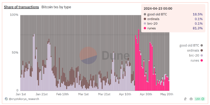 تا 22 می، رونز 12.7 درصد از تراکنش های بیت کوین را نشان می داد که بسیار بالاتر از بیت کوین اردینالزها (0.7٪) و BRC-20 (1.5٪) بود. بقیه توسط BTC گرفته شد. در نتیجه، تراکنشهای رونز بیش از 84 درصد از بالاترین سطح خود کاهش یافته است.