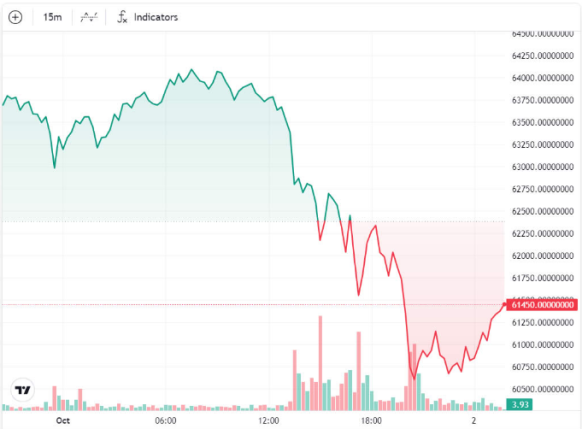 دارایی تقریباً 4,000 دلار کاهش یافت و از بالاترین قیمت روزانه 64,000 دلار در 1 اکتبر به 60,315 دلار در ساعت 20.40 UTC در تاریخ 1 اکتبر سقوط کرد. از آن زمان تا حدودی بهبود یافت و در زمان نگارش این مقاله با قیمت 61,800 دلار معامله شد.