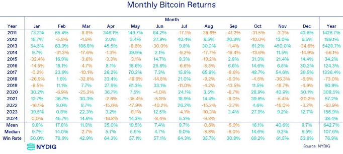 طبق دادههای NYDIG، سه ماهه چهارم سال – که اکنون کمتر از سه هفته باقی مانده است – معمولاً قویترین فصل برای بیتکوین بوده است، بهطوریکه در ماه اکتبر و نوامبر به ترتیب میانگین سودهای 16.1 و 40.6 درصدی ثبت شده است.