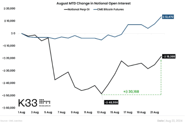 «BTC به نظر میرسد سود باز فرضی از 13 آگوست 30 هزار بیتکوین افزایش یافته است، با نرخهای مالی منفی ثابت. متوسط نرخ هفتگی تامین مالی به عمیق ترین میزان منفی خود از مارس 23 رسیده است.