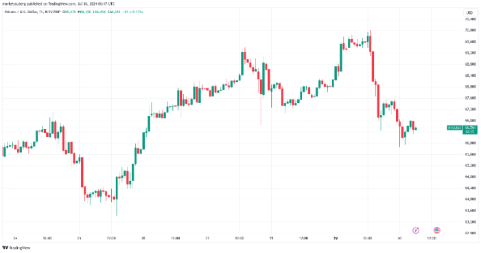 دادههای تریدینگ ویو نشان میدهد که بیت کوین/دلار آمریکا در حدود 66500 دلار معامله میشود که دور باز روزانه است.