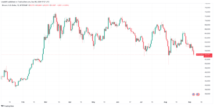 در 6 سپتامبر، بیت کوین اصلاح را تمدید کرد و با افت بیش از 5.9 درصدی از بالاترین رقم 56984 به پایین ترین سطح روزانه 53613 رسید .