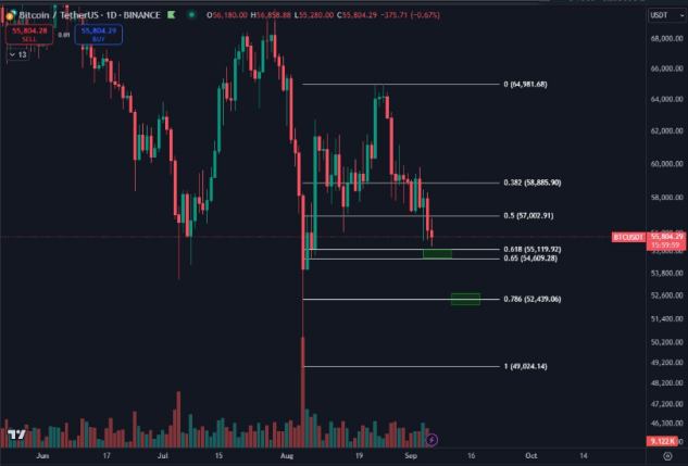 در همین حال، تحلیلگر همکار Daan Crypto Trades دو سناریو را بر اساس سطوح فیبوناچی ارائه کرد که از نوسان پایین 5 آگوست در 49,577 دلار به بالاترین سطح محلی در 65,103 در 25 اوت رسید. سناریو اول شامل جهش قیمت بیت کوین از 61.8٪ فیبوناچی بود. سطح اصلاحی در 54604 دلار.