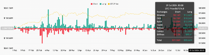 طبق دادههای تریدینگ ویو، همانطور که توسط Skew پیشبینی شده بود، قیمت بیتکوین از مرز 70000 دلار کمتر شده و به 67271 دلار معامله میشود . این منجر به انحلال بیش از 55.66 میلیون دلار موقعیت اهرمی طولانی BTC در 24 ساعت گذشته شده است که تنها در 4 ساعت گذشته 46.74 میلیون دلار نقد شده است.