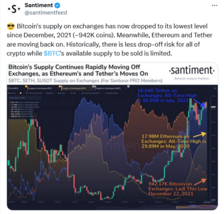 طبق پلتفرم اطلاعاتی Santiment، عرضه بیت کوین در صرافی های ارزهای دیجیتال به 942000 کاهش یافت که پایین ترین سطح آن از 22 دسامبر 2021 است .
