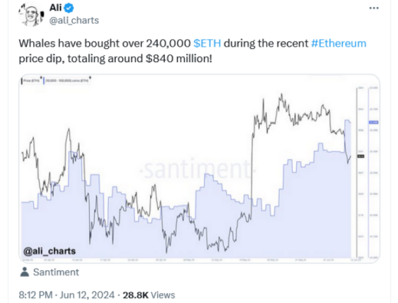 به گفته علی مارتینز، تحلیلگر صنعت، با استناد به داده های Santiment، نهنگ های اتریوم اخیراً بیش از 240000 اتر به ارزش نزدیک به 840 میلیون دلار با قیمت های فعلی خریداری کرده اند.