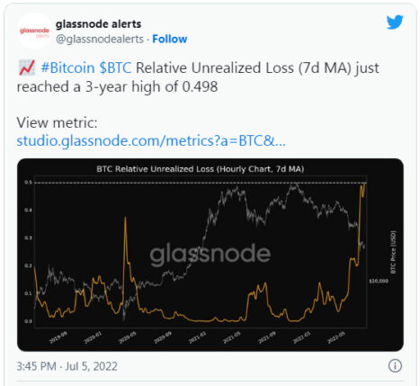 در یک نکته مثبت کمتر، Glassnode گزارش می دهد که رقم نسبی ضرر غیر واقعی (RUL) به بالاترین سطح سه ساله 0.498 رسیده است. این معیار نشان دهنده زیان کل به دلار تمام بیت کوین های موجود است که قیمت آنها در زمان تحقق بالاتر از قیمت فعلی بیت کوین بود. البته مقدار 0.498 برای RUL محدودیتی در بازار نزولی نیست. در طی اصلاحات گسترده قبلی بازار در سال 2018، این اندیکاتور به مقادیر 0.71 رسید. با این حال، کاهش بیشتر این اندیکاتور کاملاً به وضوح نشان دهنده ظهور یک حرکت صعودی جدید است، به ویژه هنگامی که همراه با سود غیر واقعی نسبی (RUP) و معیار کلی سود/زیان غیرواقعی خالص (NUPL) اعمال شود.