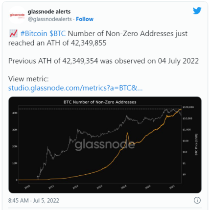 بیایید با اخبار نسبتا مثبتی از Glassnode شروع کنیم که بر اساس آن تعداد کیف پول های بیت کوین “غیر صفر” به بالاترین حد خود یعنی 42,349,855 کیف پول رسیده است. با این حال، رکورد قبلی یک روز قبل، در 4 جولای به ثبت رسید که نشان دهنده ادامه روند و ظهور گسترده سرمایه گذاران جدید BTC است. در همان زمان، کیف پول هایی با موجودی بیش از 0.01 بیت کوین و 0.1 بیت کوین نیز در حال رشد هستند و به ترتیب دارای ارزش های 10،414،216 و 3،681،161 آدرس های منحصر به فرد هستند.