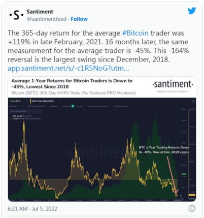 در یک خبر منفی، Santiment امروز گزارش داد که میانگین سودآوری بیت کوین تا به امروز -45٪ است. این کمترین رقم از سال 2018 است. برای اعلام تشخیص از ارزش بازار به ارزش واقعی (MVRV) استفاده شد. از یک سو، این یک واقعیت نسبتا غم انگیز است، اما از سوی دیگر سیگنال خوبی برای ورود احتمالی به بازار است. این شاخص در حال حاضر در انتهای سال 2018 قرار دارد، زمانی که قیمت یک بیت کوین تنها 3600 دلار بود.