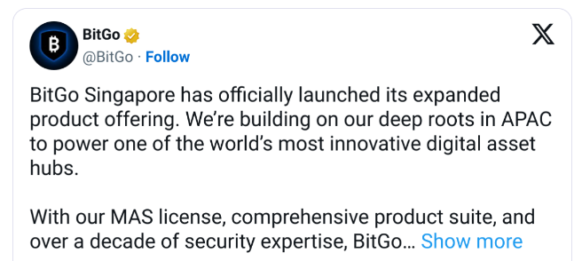 21 نوامبر راه اندازی رسمی BitGo Singapore، یک شرکت تابعه تحت نظارت محلی که به ارائه خدمات نگهداری دارایی دیجیتال، تجارت، تسویه حساب و مدیریت توکن در منطقه آسیا و اقیانوسیه (APAC) اختصاص دارد، بود.