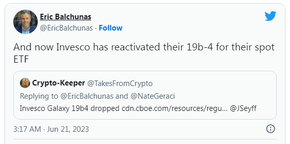 کمتر از چهار ساعت پس از ثبت درخواست WisdomTree، مدیر سرمایه گذاری جهانی Invesco برنامه خود را برای یک محصول مشابه “دوباره فعال کرد”.