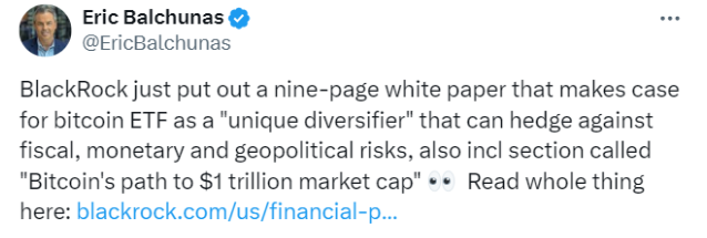 بالچوناس گزارش بلک راک را در ساعت 4:21 بعد از ظهر UTC به اشتراک گذاشت، تقریباً یک ساعت پس از اینکه بیت کوین از پایین ترین سطح روزانه خود یعنی 59354 دلار شروع به صعود کرد.