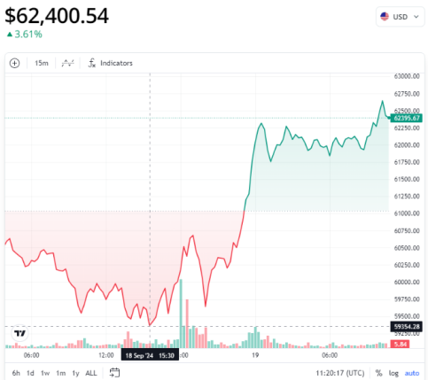 داده های کوین تلگراف نشان می دهد که بیت کوین از آن زمان تا کنون بیش از 5.7 درصد رشد کرده است تا برای اولین بار در سه هفته گذشته، برای مدت کوتاهی 62600 دلار را پس بگیرد.