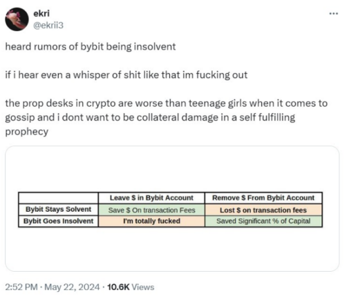 در 22 مه شایعاتی مبنی بر ورشکستگی مبادلهدر X منتشر شد . همانطور که شایعه منتشر شد، با رگباری از الگوهای رفتاری کپی کردن یک پست محبوب مرتبط با FTX که در X منتشر شد، بیشتر بزرگتر شد. فقط این بار، پستها به بای بیت اشاره کردند.
