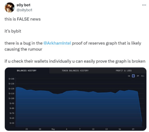 یکی از کاربران ارزهای دیجیتال حدس زد که ممکن است یک اشکال در نمودار اثبات ذخیره از Arkham Intelligence باعث این شایعه شده باشد.