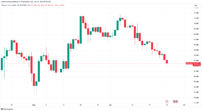 داده های تریدینگ ویو تایید می کنند که بیت کوین پس از آخرین بسته شدن هفتگی خود ناامید شد و به طور پیوسته افت کرد و به 62128 دلار در بیت استمپ رسید.
