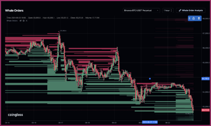 نمودار همراه کوین گلس سفارشات اخیر نهنگ در جفت مبادله دائمی بایننس BTC/USDT را نشان می دهد.