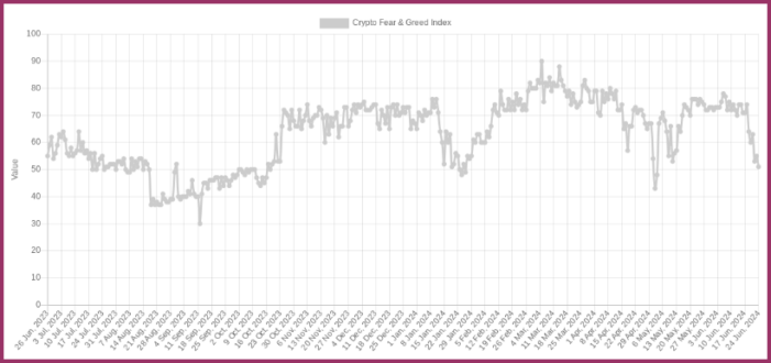 با 51/100 از 24 ژوئن، شاخص ترس و طمع کریپتو به پایین ترین سطح خود در سال 2024 نزدیک شده است.