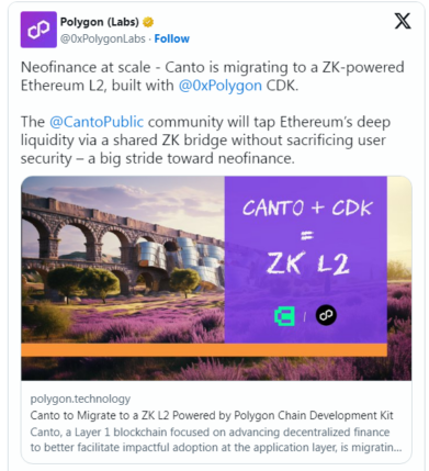 پالیگان لبز در 18 سپتامبر توضیح داد که بر اساس توافق رسمی به دست آمده توسط Canto Commons – چارچوبی که مشارکت کنندگان ایده ها و راه حل های پروتکل را هماهنگ می کنند – توسعه دهندگان اصلی آن یک ZK-rollup را روی لایه دوم اتریوم ایجاد خواهند کرد: