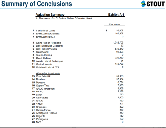 دو روز پس از دستیابی به اجماع در مورد طرح سازماندهی مجدد سلسیوس ، پرونده دادگاه در 28 سپتامبر صحت ارزش دارایی ها و بدهی های بدهکاران را تأیید کرد. استوت ریسیوس راس ارزیابی داراییهای ارز دیجیتال، وامها و سرمایهگذاریهای جایگزین را انجام داد.