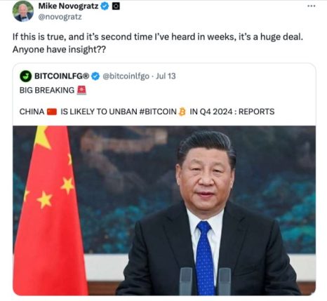 در ۱۴ ژوئیه، مایک نووگراتز ، مدیرعامل گلکسی دیجیتال در X به اشتراک گذاشت که گزارشهایی شنیده است مبنی بر اینکه چین احتمالاً بیتکوین را تا اواخر سال ۲۰۲۴ لغو ممنوعیت خواهد کرد.
