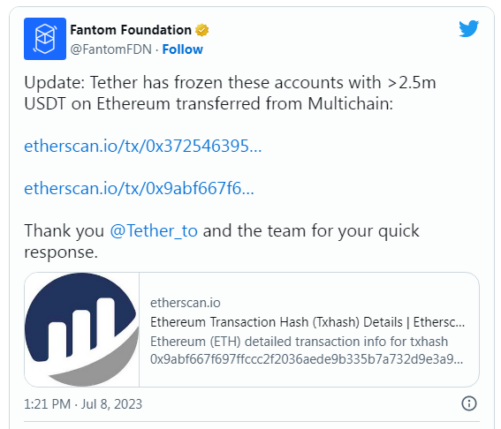 طبق پروتکل نمودار دانش 0xScope، سه آدرسی که حداقل 63.2 میلیون دلار به صورت USD Coin (USDC) از مولتی چین دریافت کردهاند، اکنون مسدود شدهاند. گزارش دیگری از بنیاد فانتوم اشاره میکند که بیش از 2.5 میلیون دلار تتر (USDT) نیز از دو آدرسی که توسط اتراسکن بهعنوان «آدرسهای مشکوک چند زنجیرهای» فهرست شدهاند مسدود شده است.