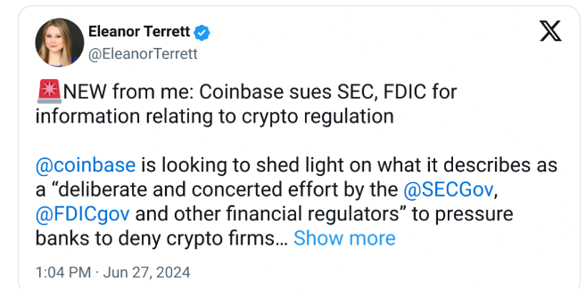 کوین بیس در 27 ژوئن علیه کمیسیون بورس و اوراق بهادار ایالات متحده (SEC) و شرکت بیمه سپرده فدرال (FDIC) شکایت کرد.