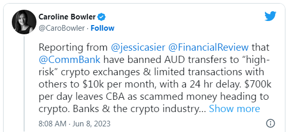 در 8 ژوئن، CBA اعلام کرد که «برخی پرداختها به صرافیهای ارزهای دیجیتال» را به عنوان بخشی از «اقدامات جدید برای محافظت از مشتریان در برابر خطرات کلاهبرداری مرتبط با پرداختهای خاص به صرافیهای رمزنگاری»، رد میکند یا به مدت 24 ساعت تعلیق میکند.