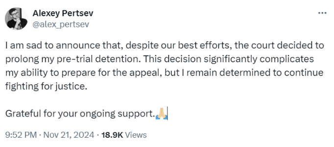 پرتسف، توسعهدهنده پروتکل ارزهای دیجیتال تورنادو کش، در یک پست در 21 نوامبر X اعلام کرد که در انتظار محاکمه خود در بازداشت باقی خواهد ماند: