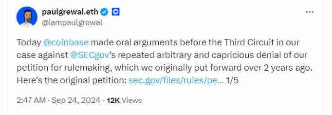پل گروال، مدیر ارشد حقوقی کوین بیس در پستی در X در 24 سپتامبر گفت که SEC “از ارائه توضیح معقول برای انکار barebones خود خودداری می کند، اما از اختیارات ادعایی خود برای مشارکت در یک کمپین اجرایی خودسرانه علیه صنعت ما استفاده کرده است.”