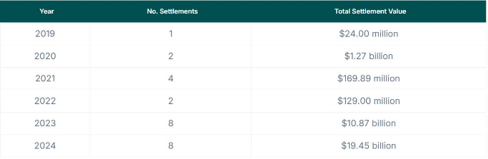 در هشت تسویه حساب در سال 2024، رگولاتورها 78 درصد بیشتر از سال 2023 به دست آورده اند که فقط 10.87 میلیارد دلار پرداخت شده است. با این حال، این افزایش 8327 درصدی در ارزش های تسویه در مقایسه با سال 2022 است.