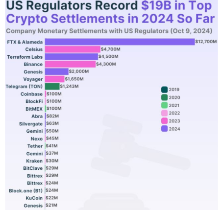 از سال 2019، رگولاتورهای ایالات متحده در مجموع 31.92 میلیارد دلار تسویه حساب از 25 شرکت کریپتو در پرونده های مختلف حقوقی جمع آوری کرده اند.