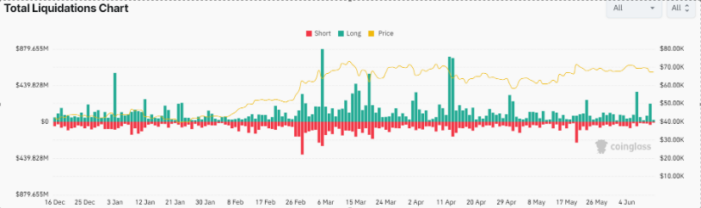 در 11 ژوئن، بیت کوین 2.5 درصد کاهش یافت و از بالاترین قیمت روزانه 69547 دلار به 66018 دلار کاهش یافت. اتر با کاهش 2.58 درصدی به 3500 دلار، درصد کاهش بیشتری را تجربه کرد. این رکود در بازار ارزهای دیجیتال تأثیر قابل توجهی بر معاملات اهرمی گذاشت و نزدیک به 200 میلیون دلار را از بین برد.