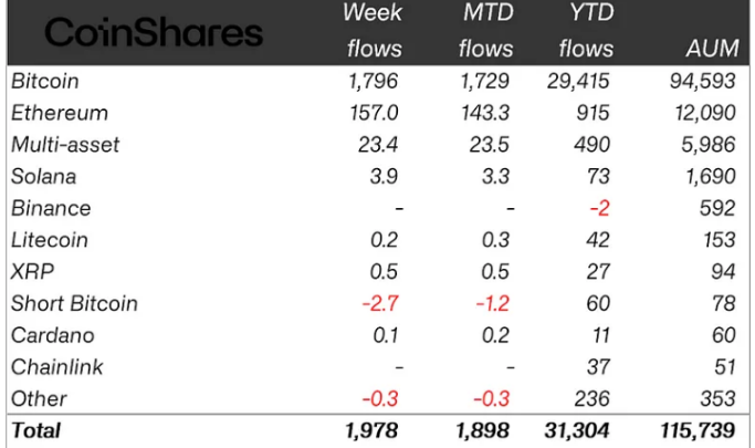 کوین شرز در 11 نوامبر گزارش داد که محصولات سرمایه گذاری کریپتو شاهد 1.98 میلیارد دلار ورودی از 3 تا 9 نوامبر بودند که دارایی های جهانی تحت مدیریت را به رکورد 116 میلیارد دلار رساند.