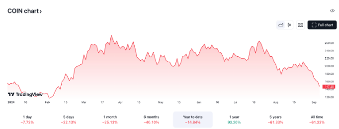 بر اساس گزارش CNBC، سهام کوین بیس (COIN) بدترین هفته خود را در سال 2024 ثبت کرد و سهام به پایینترین ارزش خود از فوریه سقوط کرد. طبق دادههای تریدینگ ویو، COIN در 6 سپتامبر در 147 دلار بسته شد. سهام از سال تا به امروز حدود 14 درصد کاهش یافته است.