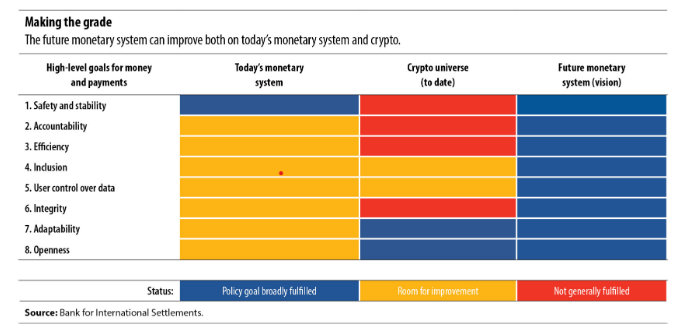 یک مطالعه BIS در ماه ژوئن نشان داد که ارزهای رمزنگاری شده از اکوسیستمهای فیات برای دستیابی به اهداف سطح بالای یک سیستم پولی آینده پیشی میگیرند.