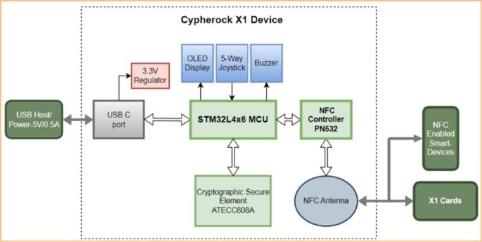 X1 Vault دارای یک صفحه نمایش OLED و یک جویاستیک ۵ جهته برای تعامل با کاربر است. برای کسانی که از نظر فنی تمایل بیشتری دارند، اسناد سایفر راک این دیدگاه را از عملکرد داخلی دستگاه به ما ارائه میدهند: