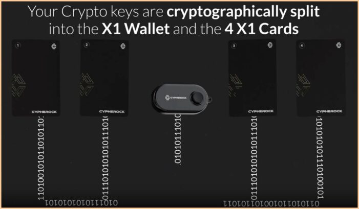 برخلاف سایر کیف پولها، سایفر راک خروجی را با استفاده از اشتراکگذاری مخفی شمیر در سطح آنتروپی پراکنده میکند و ۲۵۶ بیت را به ۵ قسمت ذخیره شده در X1 Vault و ۴ کارت X1 تقسیم میکند. آستانه ۲/۵ تضمین میکند که هر دو مؤلفه میتوانند عبارت اولیه را بازسازی کنند و امنیت را در برابر نقاط شکست واحد افزایش میدهد.