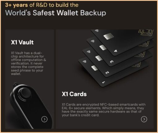 سختافزار غیرقابل ارتقا : برای جلوگیری از نفوذ عوامل سرکش داخلی به سیستم عامل مخرب یا شرکتهایی که بهروزرسانیهای ناخواسته انجام میدهند (به شما نگاه میکنم، لجر)، کلیدهای خصوصی هرگز به طور دائم روی سختافزار قابل ارتقا ذخیره نمیشوند. X1 Vault قابل ارتقا، یک شارد کلید را ذخیره میکند، در حالی که کارتهای X1 غیرقابل ارتقا هر کدام ۴ شارد کلید را ذخیره میکنند. ماهیت متنباز و اعتبارسنجی آن توسط Wallet Scrutiny، یکپارچگی سیستم عامل را تضمین میکند.