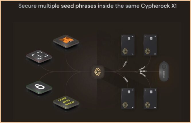کیف پول سخت افزاری سایفر راک X1 میتواند تا چهار کیف پول را محافظت کند که هر کدام عبارت بازیابی منحصر به فرد خود و امکان اعمال پینهای مجزا را دارند. به عنوان مثال، کاربری که هم یک کیف پول نرمافزاری و هم یک کیف پول سختافزاری با دو عبارت بازیابی مجزا را مدیریت میکند، میتواند این موارد را به سایفراک X1 وارد کند و اساساً آن را به یک مخزن امن عبارت بازیابی برای مدیریت بهینه عبارت بازیابی برای چندین کیف پول یا کاربر تبدیل کند.