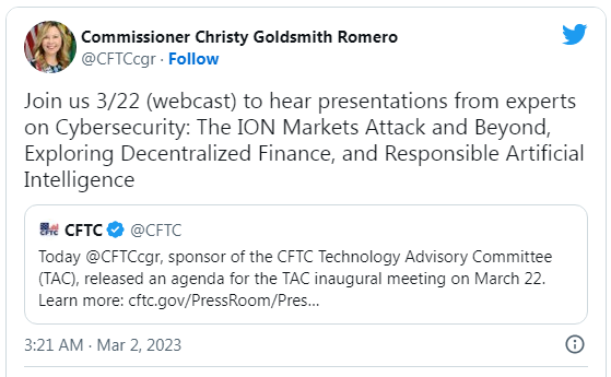 کمیسیون معاملات آتی کالا (CFTC) در تاریخ 1 مارس اعلام کرد که دستور جلسه 22 مارس کمیته مشاوره فناوری آن شامل پانلی در مورد “کاوش در مسائل مالی غیرمتمرکز” خواهد بود.