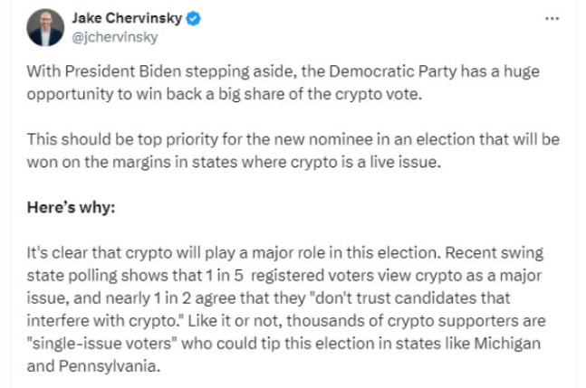 به گفته جیک چروینسکی، وکیل رمزارز در پستی در X، نامزد جدید ریاست جمهوری حزب دموکرات باید کریپتو را در اولویت قرار دهد.