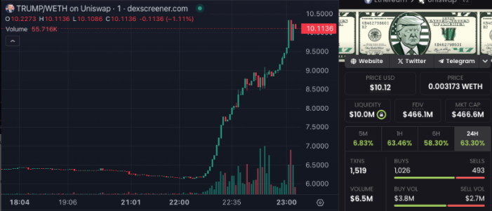 بر اساس دادههای DexScreener، میمکوین MAGA مبتنی بر اتریوم بلافاصله پس از ترور از قیمت 6.31 دلار به 10.36 دلار افزایش یافت و ارزش کل بازار آن از 293 میلیون دلار به 469 میلیون دلار در کمتر از 45 دقیقه افزایش یافت.